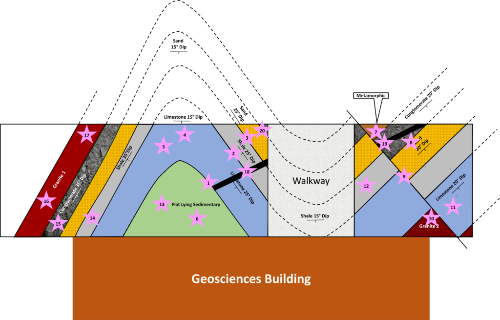 Interpretation Gardens: A new take on the traditional rock garden. In an Interpretation Garden 20+ stations (miniature outcrops) are positioned at precise positions within a campus green space. Each station consists of 1-2 quarry stones or boulders positioned to a pre-planned strike and dip. Most stations have just one stone, stations with two stones illustrate a formation contact, fault or unconformity. Students can use the stations to map out a multitude of geologic features. Highly useful teaching tool that can be used extensively in at least 7 undergraduate courses.